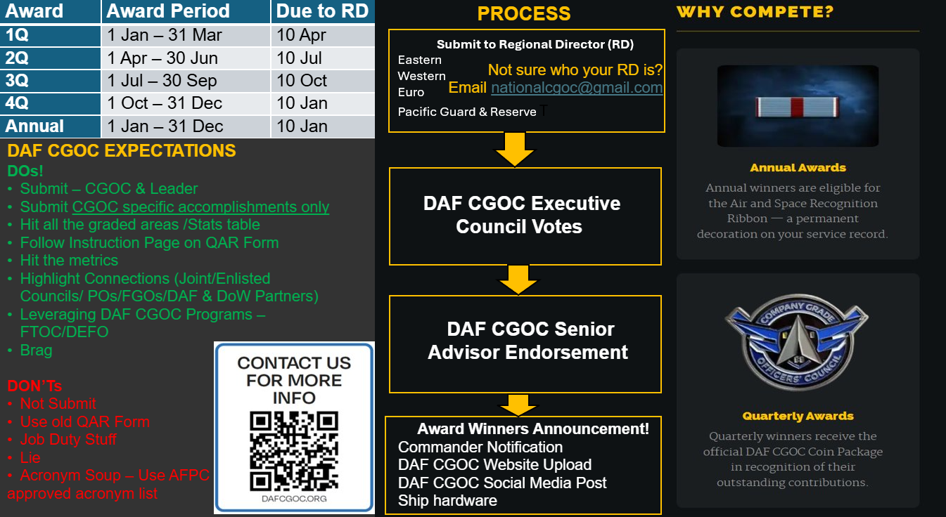 The Dept. of the Air Force Company Grade Officers’ Council is here to provide base CGOC resources to start up or revive councils. Feel free to download these documents.